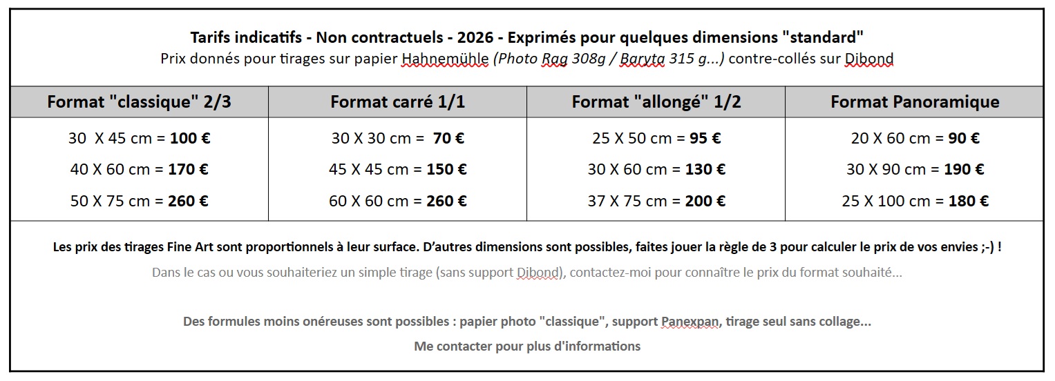 Je propose des tirages à des tarifs plus « modestes », imprimés par un laboratoire distant (papier photo Fujifilm), et contre-collés si besoin sur un support rigide moins cher que le Dibond (Panexpan – support pvc – 5mm d’ épaisseur). Certes, la démarche est moins locale, mais tout aussi artisanale (collage par mes soins), et la qualité esthétique est clairement au rendez-vous. Solution idéale pour les plus petits budgets ou les expositions…!